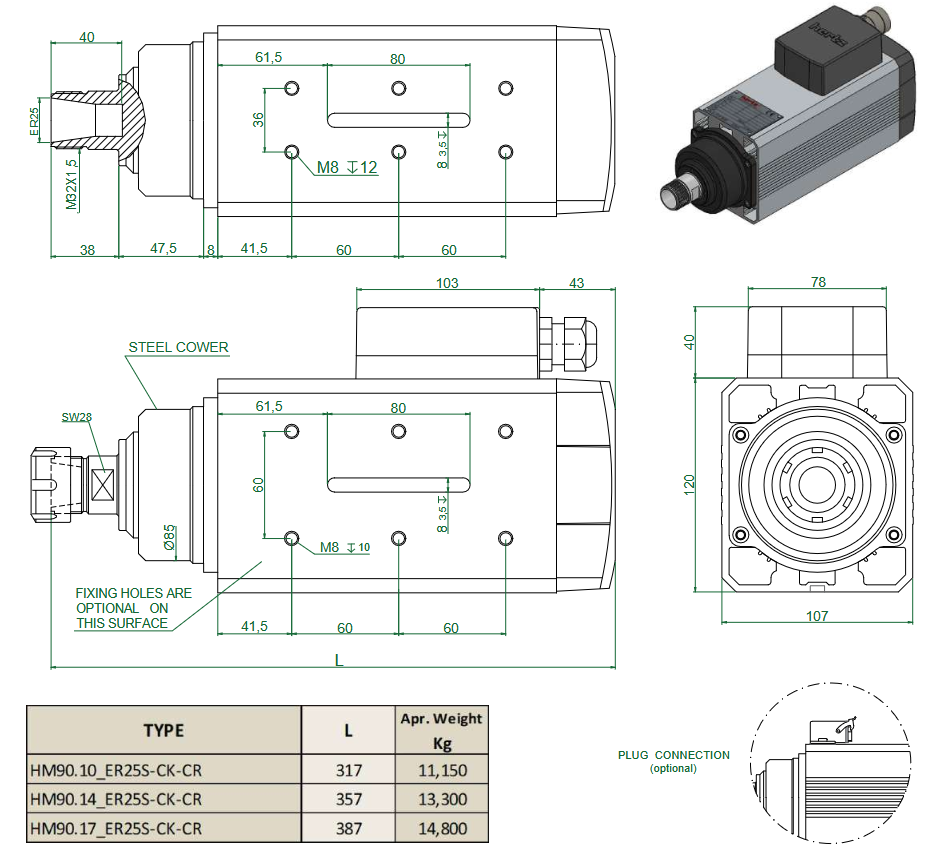 Standardul alimentarii pentru acest model este de 380V si prindere de ER25. Optional putem realiza alimentare 220V sau 220/380V si prindere ER32 sau ER25.