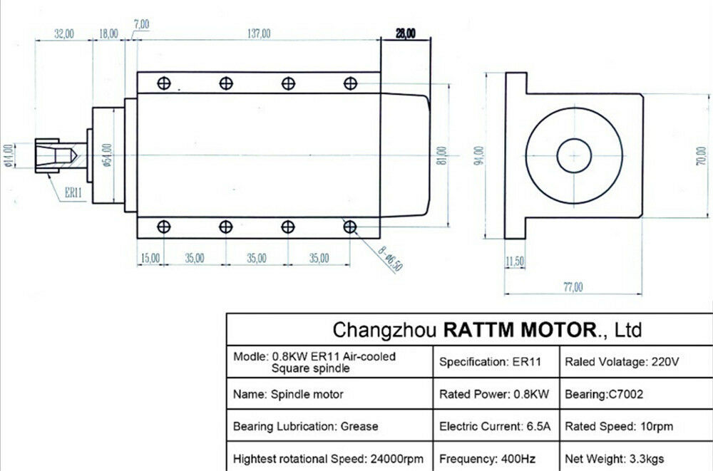 Motor frezare rectangular 800W 0.8kW 220V racire aer si penseta prindere ER11 94x77mm