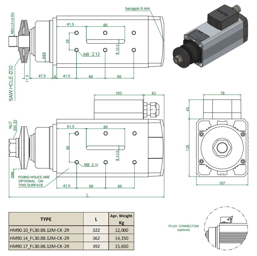 Spindle Hertz Motor HM90.XX_FL30.88.12M-CK-2R rectangular prindere cu flansa 88mm pentru panza cu diametrul interior de 30mm