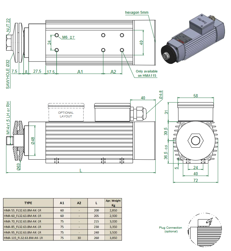 Spindle Hertz Motor HMA.XX_FL32.63.8M-AK-1R rectangular prindere cu flansa 63mm