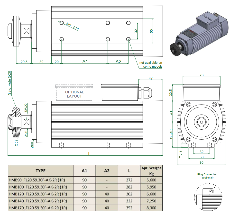Spindle Hertz Motor HMB.XX_FL20.59.30F-AK-2R (1R) rectangular prindere cu flansa 59mm pentru panza cu diametrul interior de 20mm - Copie