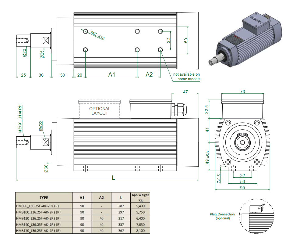 Spindle Hertz Motor HMB.XX_L36.25F-AK-2R (1R) rectangular cu canal pana 20 mm SW22