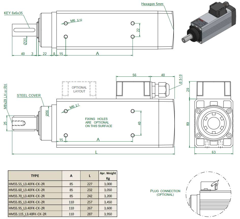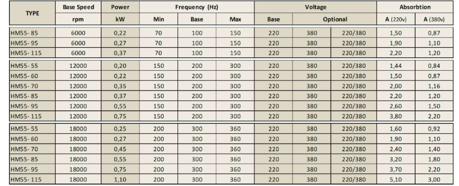 Spindle Hertz Motor HM55.XX_L3.40FK-CK-2R rectangular cu axa de 20mm cu canal pana
