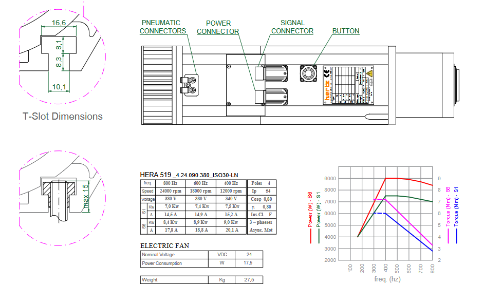 Spindle Hertz Motor HERA 519/509 cu ATC ISO30 S6 3.3-9.0 KW 380V cu ventilator 24V